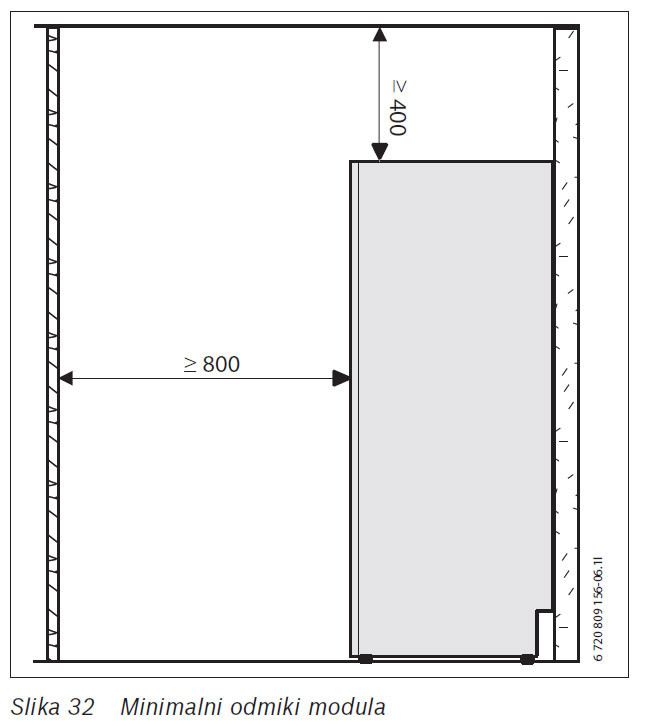 - razmik zunanje enote od zidov, hodnika, teras, itd., ne sme biti manjši od minimalnih odmikov (glejte sliko spodaj)