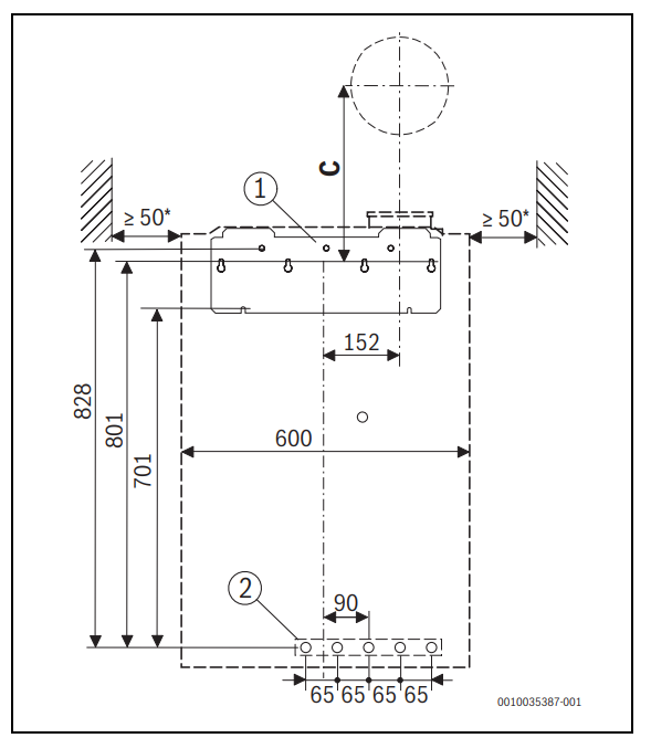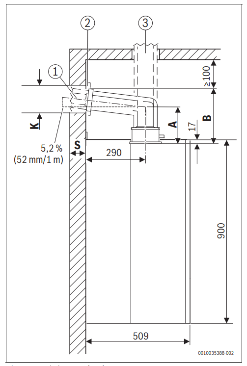 A Razdalja od zgornjega roba naprave do središčnice vodoravne dimovodne cevi