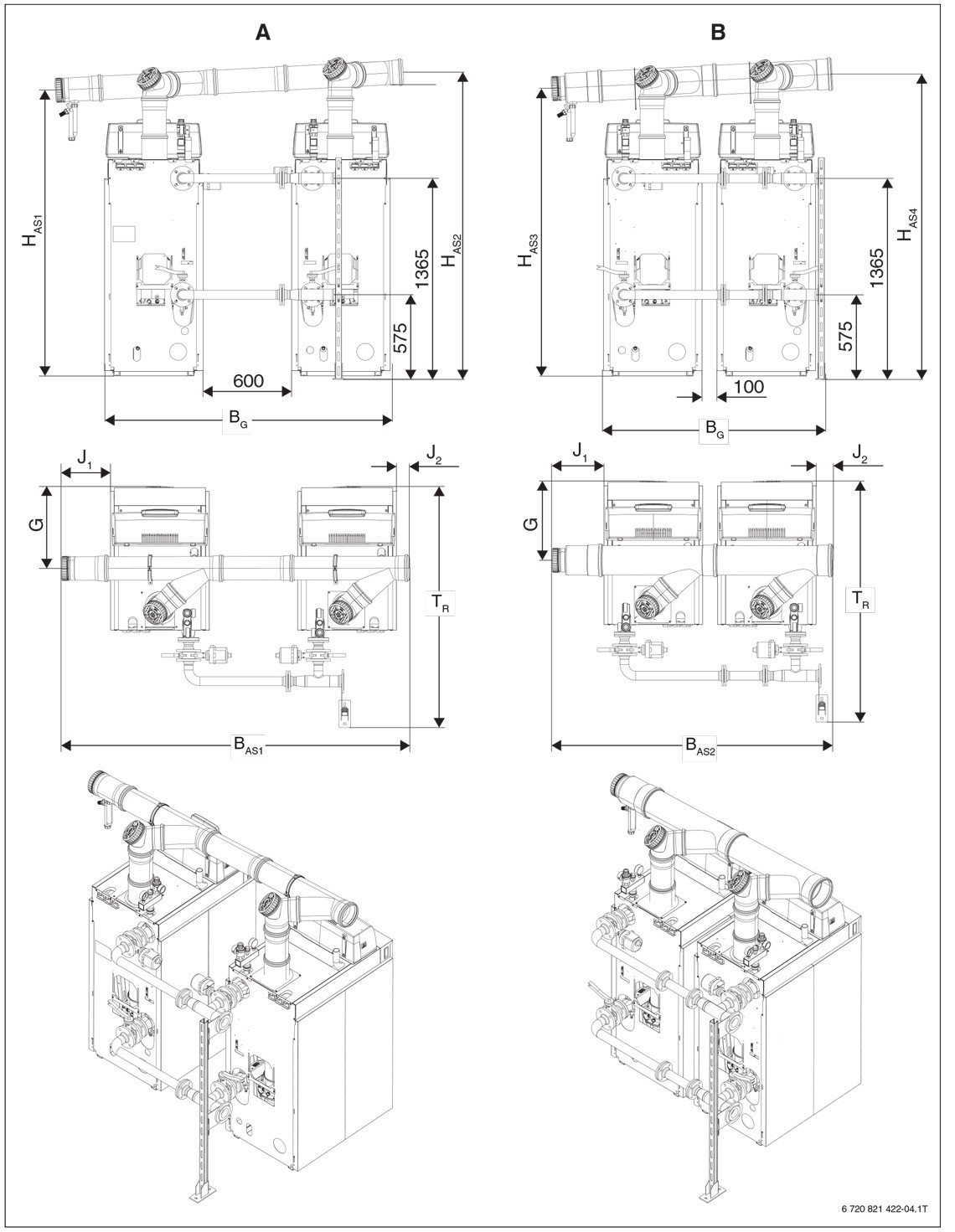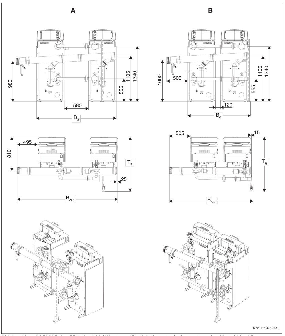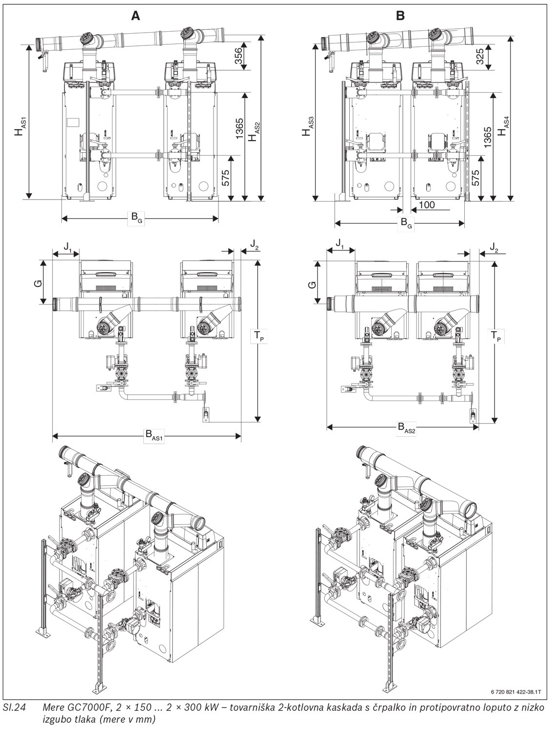 | Globina T s črpalkami (sprednji rob kotla do zunanjega roba prirobnice kaskade) | TR | mm | 2035 | 2395 | 2395 | 2395 |