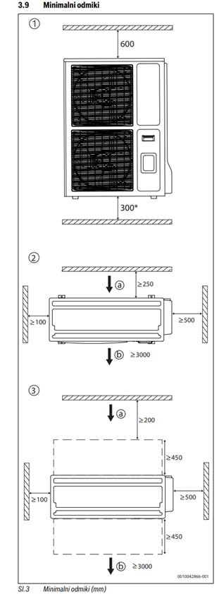 Minimalni odmiki za postavitev zunanje enote Compress 3400i AW: