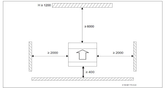 - pri postavitvi toplotne črpalke bodite pozorni na minimalne odmike od zidov, teras itd…(glejte sliko spodaj)