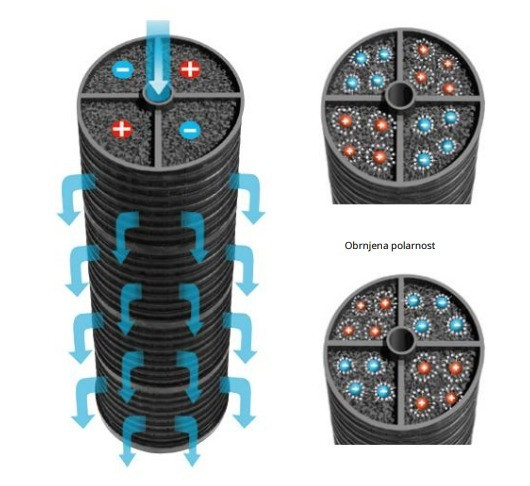 Aktivna enota je razdeljena na štiri ločena območja oziroma elektrode. Voda teče od znotraj navzven skozi aktivno enoto (kartušo) z mikroelektrodami, ki jih polarizirajo napetostni impulzi. Vsaka elektroda je sestavljena iz prevodne, porozne strukture in ima pri pretoku vode različno polariteto (pozitivno / negativno), ki se med obdelavo vode izmenično obrača. Vodni kamen se nalaga na negativno nabite mikroelektrode in se s periodično menjavo polarnosti odstrani v obliki drobnih nanokristalov. Ti delujejo kot kristalizacijski centri, na katerih se odlaga vodni kamen, ki ga nato preprosto spere tok vode.