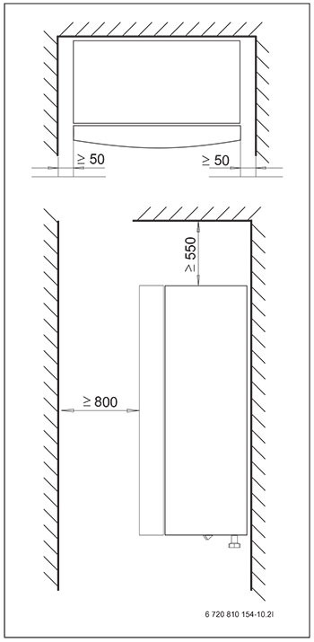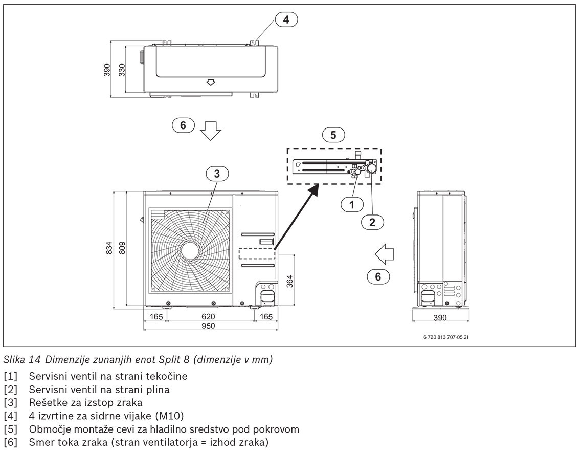 - razmik zunanje enote od zidov, hodnika, teras, itd., ne sme biti manjši od minimalnih odmikov (glejte sliko spodaj)