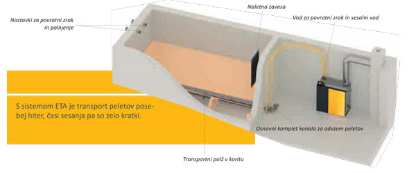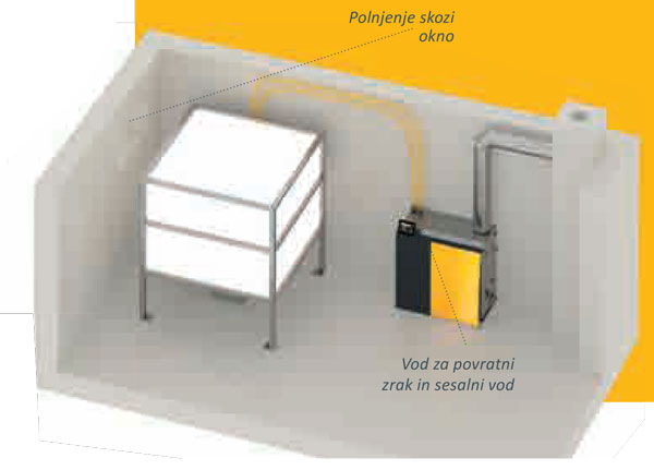 - vgrajena patentirana sesalna turbina za sesanje pelet iz zunanjega zalogovnika v vmesni zalogovnik