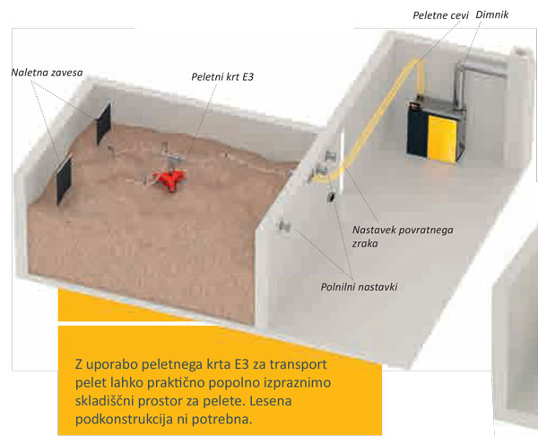 Zalogovnik za pelete je lahko oddaljen tudi do 20 m ali do višine dveh nadstropij. Če v hiši ni prostora, lahko zalogovnik postavite tudi v pomožni objekt ali zemeljski rezervoar. Edini pogoj je, da je skladišče suho, da peleti niso izpostavljeni vlagi.